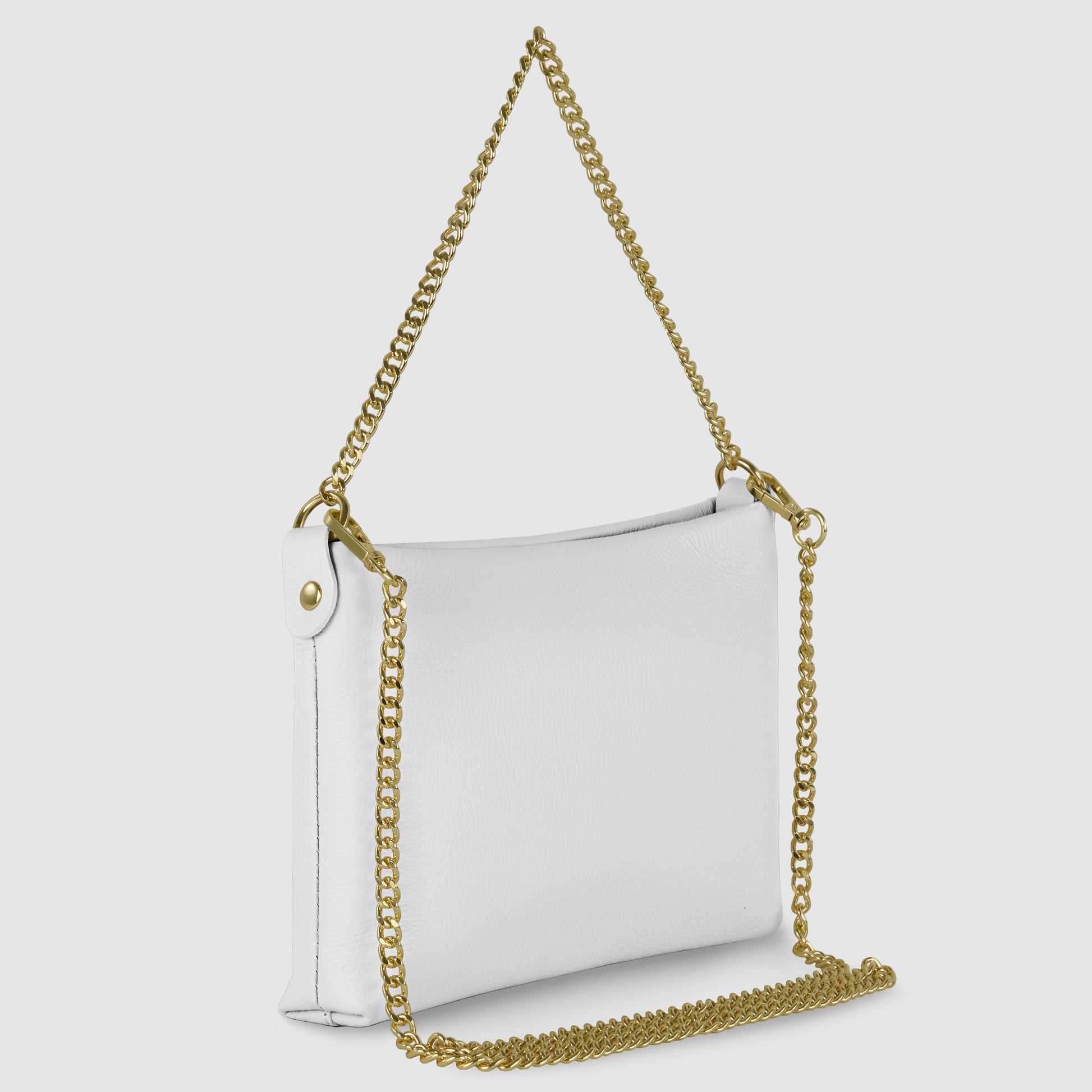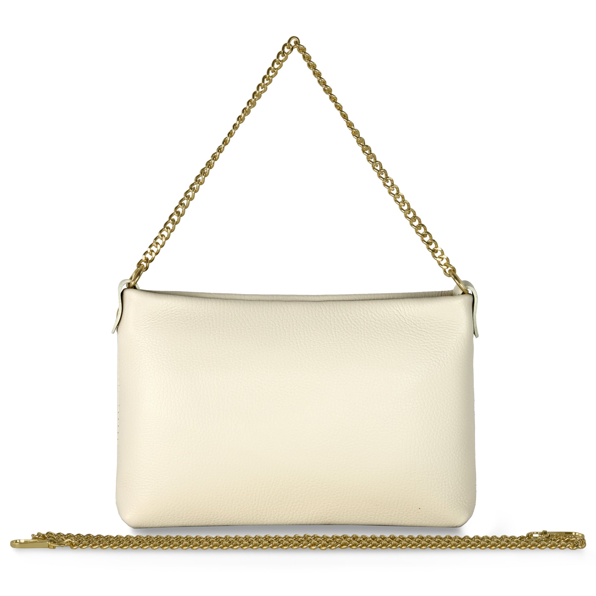 A fixed short chain handle in glossy gold-tone metal lets you carry it by hand or over the arm. A detachable long chain offers shoulder or crossbody wear. A smooth metallic zipper ensures secure closure, and all hardware glows in matching gold.