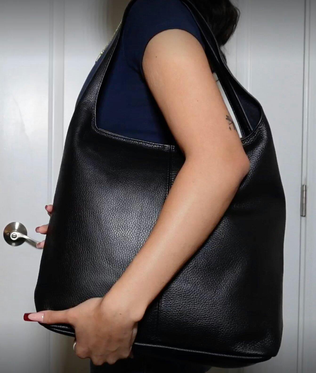 I love that the inside is completely unlined, it gives the bag such a relaxed, effortless vibe. The single, spacious compartment fits everything I need, and the zip closure makes it feel secure and practical. The long shoulder strap sits perfectly under my arm, so it’s super comfortable to carry.