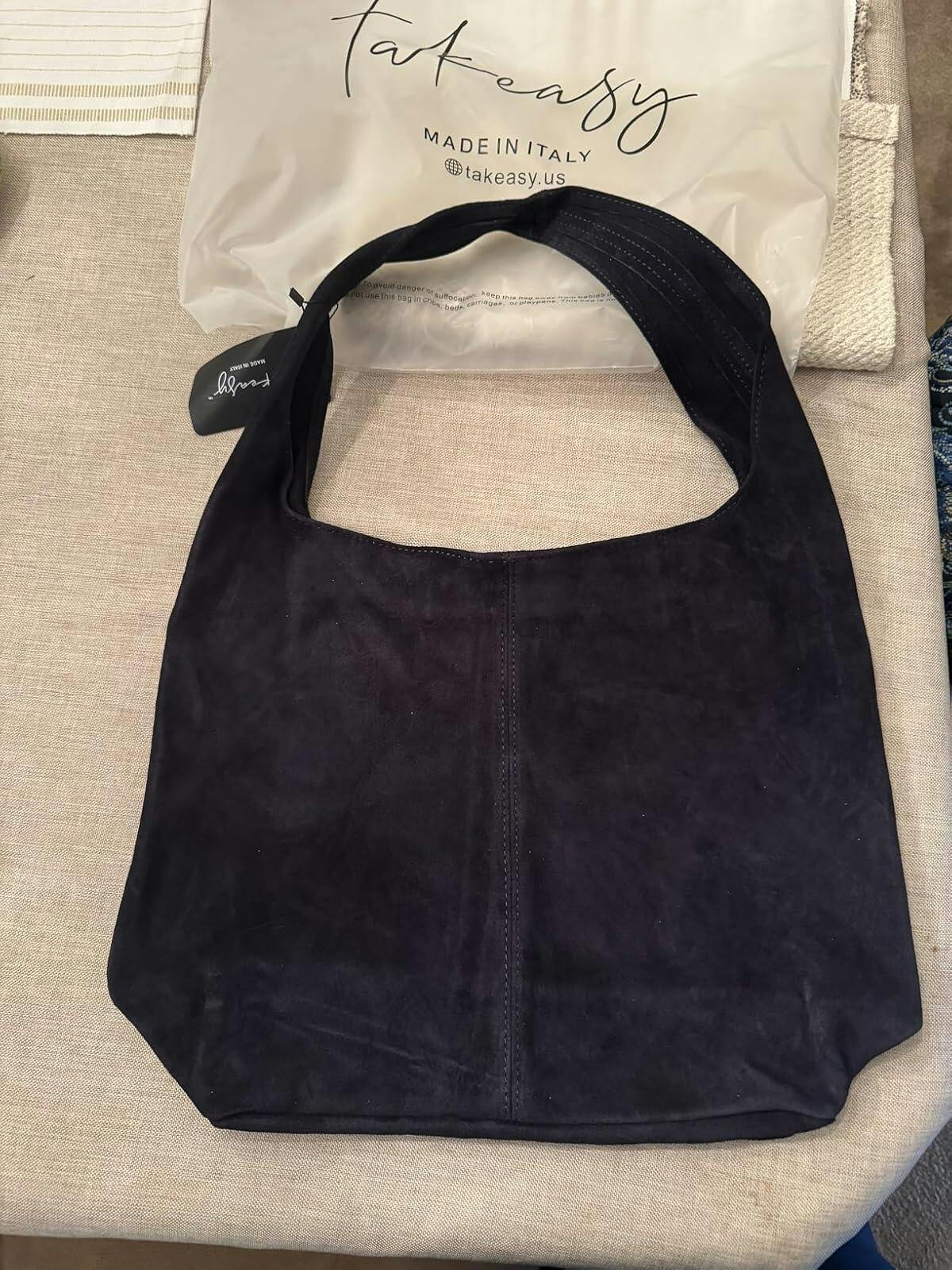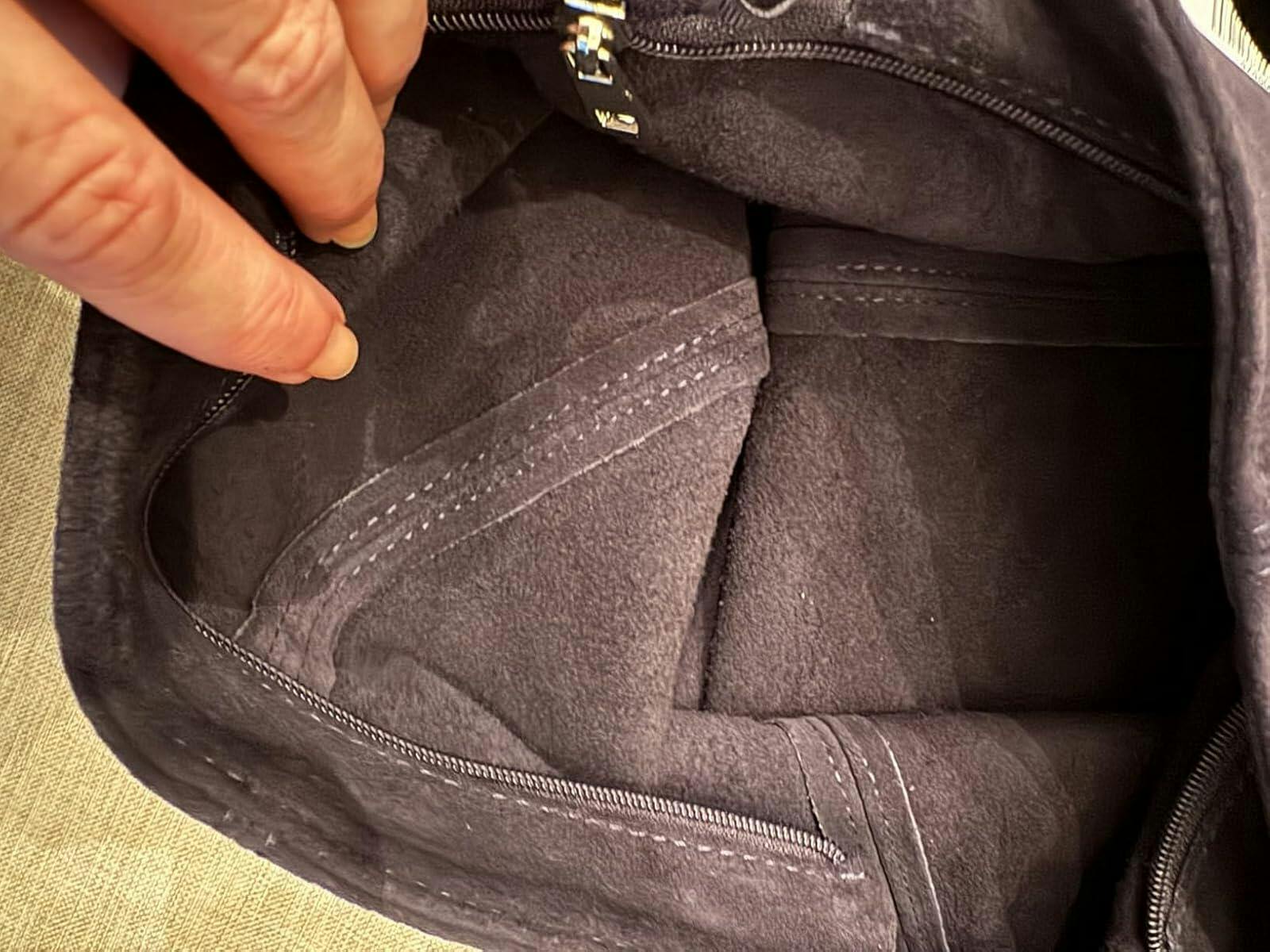 This suede hobo bag is really great, and exactly as described. It is the definition of a hobo bag in that it’s loose, lightweight and unstructured, which makes it a great slouchy bag. The suede is soft and seems to be great quality. The color is as shown in the listing photos, a nice dark blue. It easily hangs on my shoulder and is easy to carry. The inside has no lining, it is just the inside of the suede; that is the one improvement I think I would like to see is a liner to protect the inside and some sort of pocket I can slide a key and some lip gloss inside. In a big bag like this it is nice to have a little pocket, but for now I’m using some small cosmetic bags to wrangle my lip gloss and other small items. The quality of the bag seems really nice.