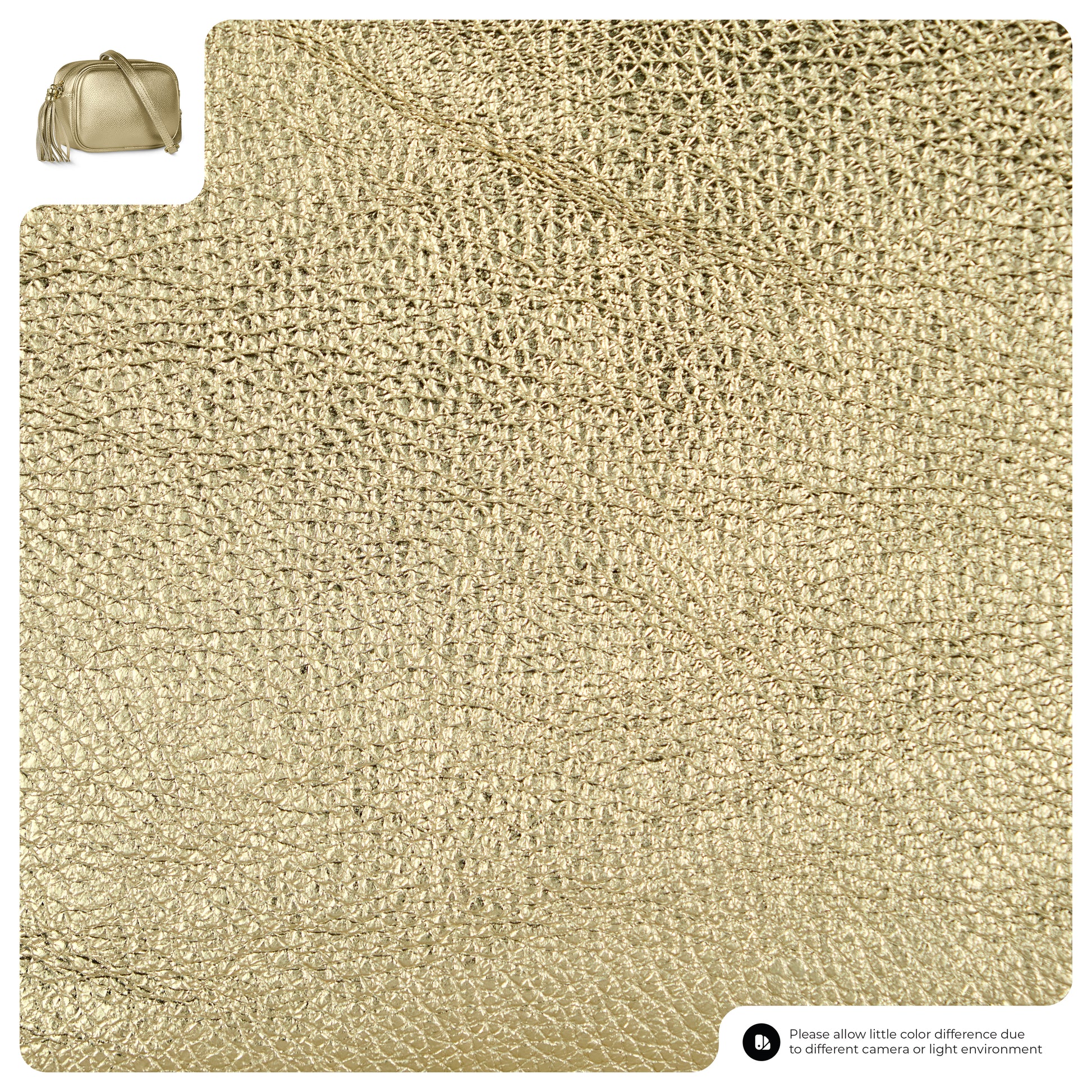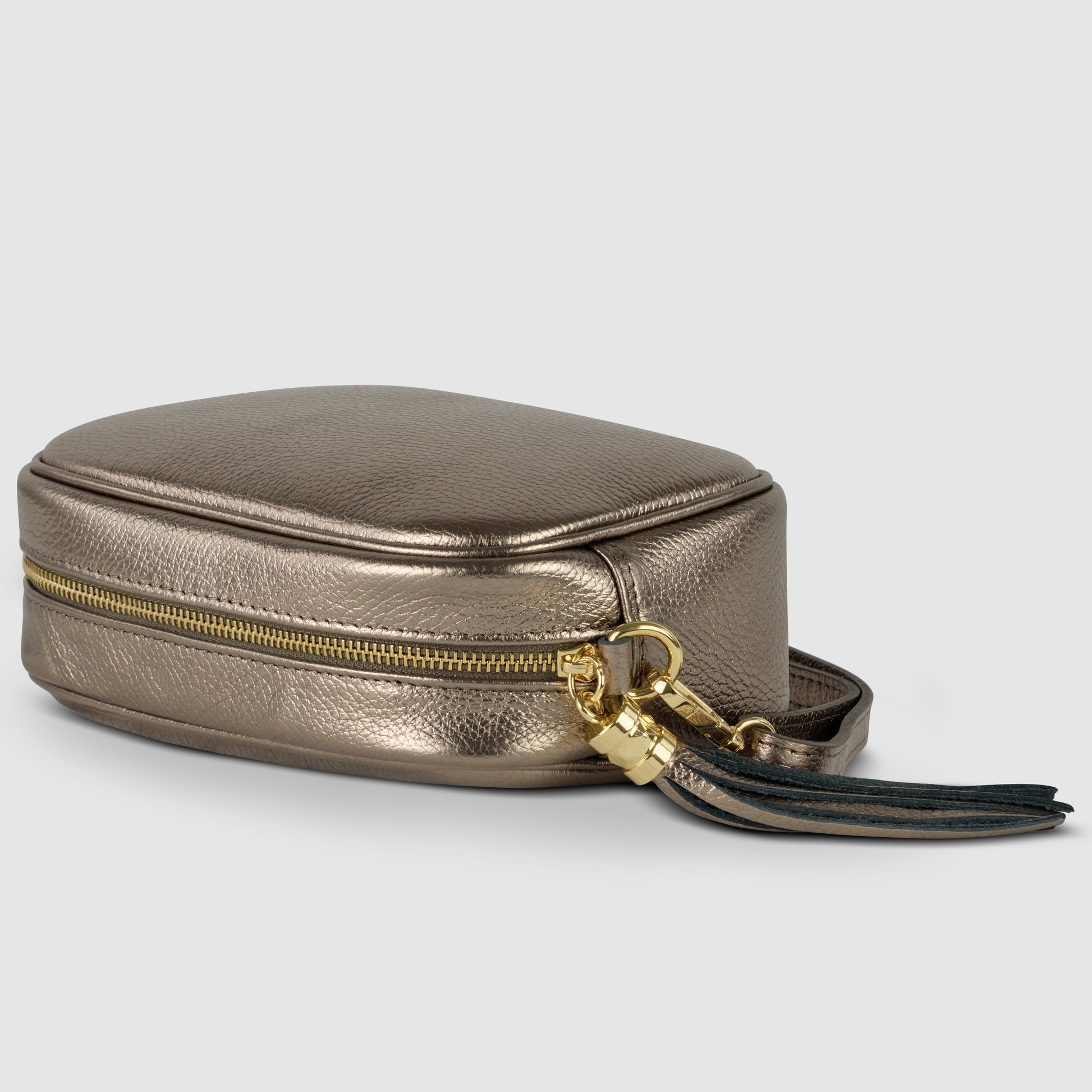 The zipper is finished with a matching leather tassel puller that adds texture and movement. The long strap adjusts for shoulder or crossbody wear and detaches easily for hand-carry styling. Gold-tone hardware throughout enhances its elegant feel.