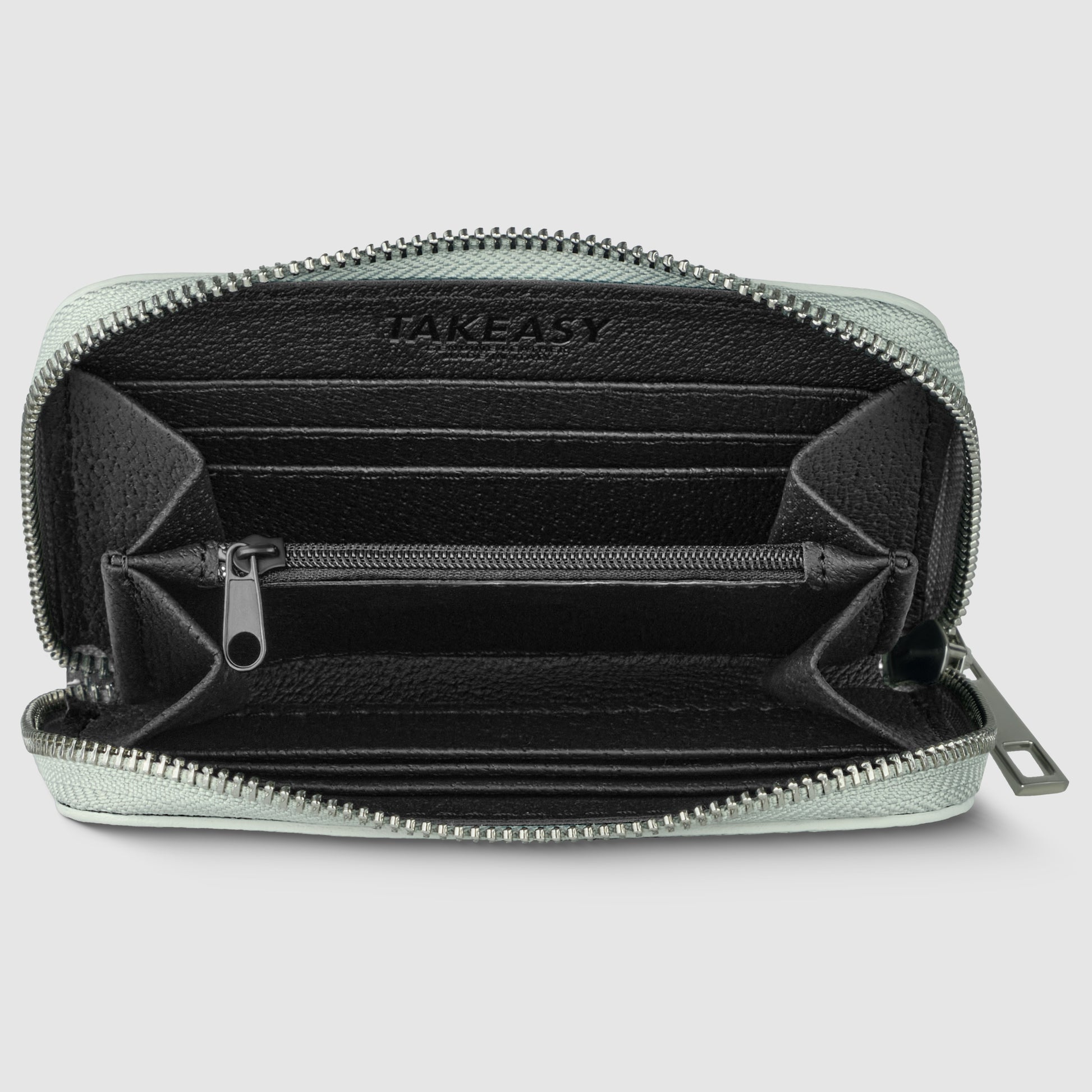 Inside, silky polyester twill lines a thoughtful interior: two compartments for bills, a center zip pocket for coins, and six card slots. Every feature is streamlined for simplicity and ease.