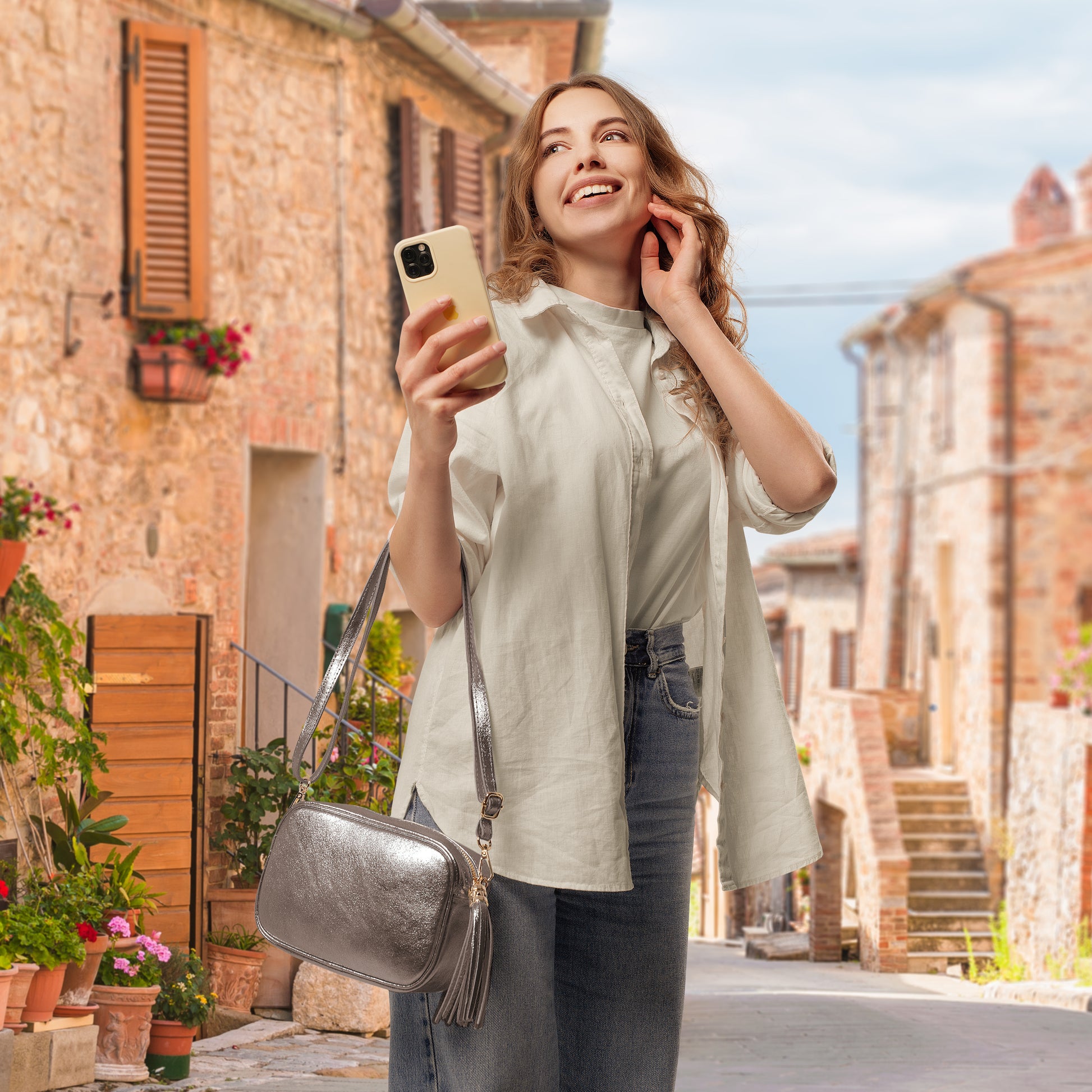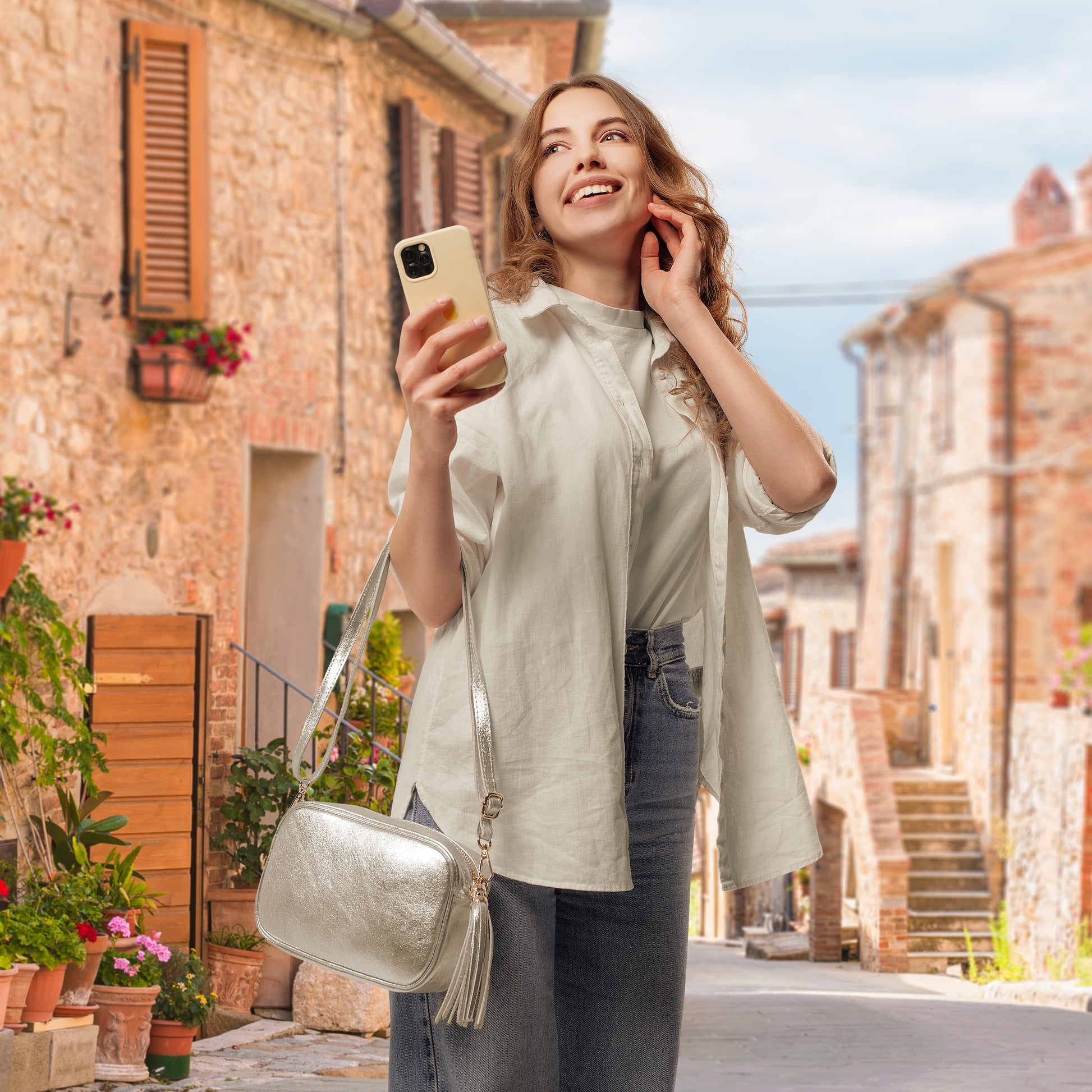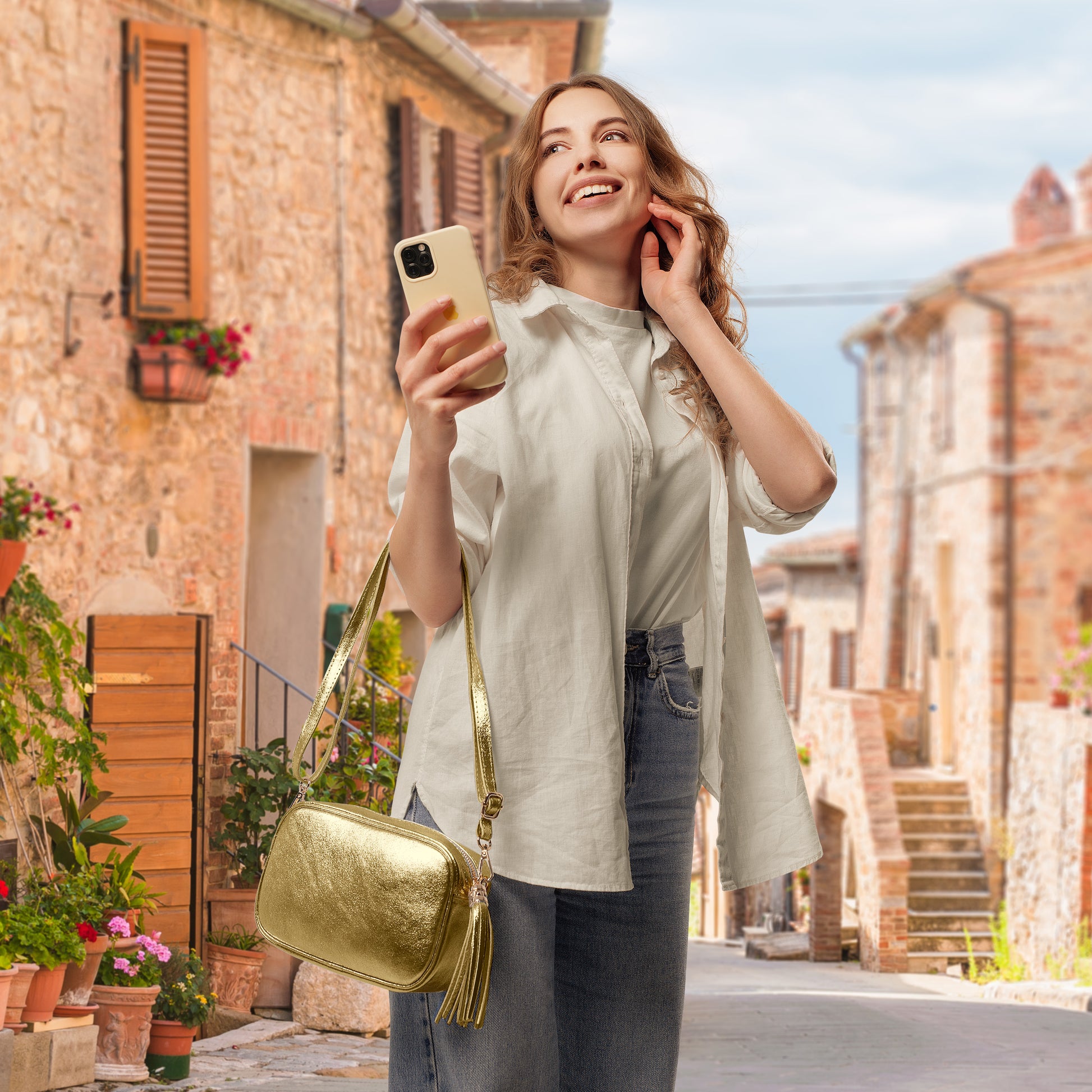 I took this purse on vacation and it was the perfect companion! It fit all my necessities including phone, wallet, and a light scarf. The champagne gold leather has a durable metallic finish that held up to wear. The leather is supple, and the tassel on the zipper is very convenient. The crossbody strap made it easy to wear hands-free. I was able to wear this purse with my fanciest outfits due to the glamorous metallic finish. The simple and convenient design also matched my more casual outfits. Highly recommend!