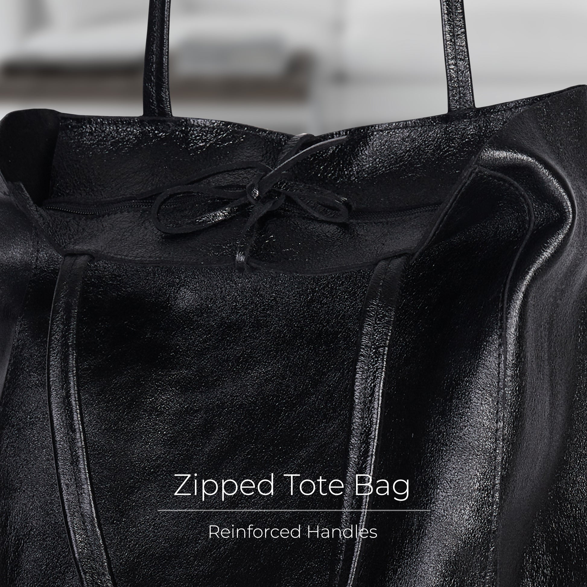 Mid-length handles are firmly stitched to allow for shoulder or hand carry. A zipper keeps everything secure, while the top leather drawstring ties into a bow — a handmade touch. Silver-toned hardware adds a clean finish.