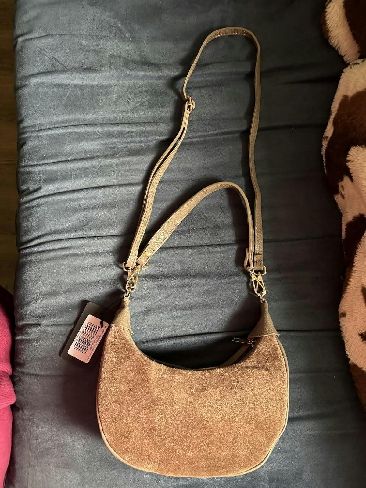 Lovely suede bag! So hard to find a nice real suede bag in navy blue and this bag is perfect! Stylish and nicely shaped, not large but holds the essentials and arrived quickly and nicely packaged. Very happy with my purchase and have already received compliments!